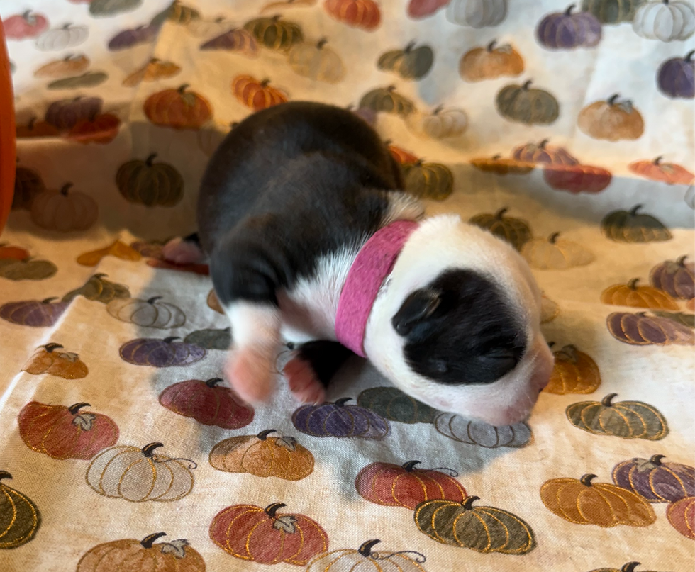 Kaia- (Neon Collar) is a Female with a black and white coat. She is the smallest in the litter. Her markings are coming in nicely to fill in the nose. Nice wide stripe on the head for that classic Boston look.